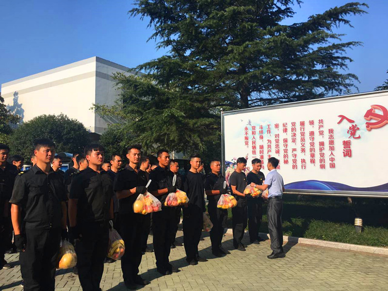 9月18日,嘉兴公司副总经理徐涯立、纪委书记施骋在办公室及大队领导的陪同下带着慰问品,对顶着烈日在嘉兴人民警察学校排练盾牌警棍术的队员进行了慰问。正在训练的队员以精神焕发的姿态、整齐划一的动作展示了一周的成果,徐副总观看后高度赞扬了他们排练的效果和付出的努力,叮嘱大家注意安全,保重身体,并鼓励队员们继续努力,争取在最终汇演中取得好成绩,最后送上了水果等慰问品。