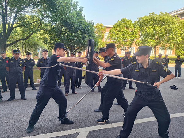 一、开学季校园大练兵。开学前夕,浙江衢州安邦保安服务有限公司开展开学季大练兵活动。以防暴、消防、反诈等为重点,通过模拟真实场景,让队员在实践中重温钢叉、盾牌等安保器械的使用方法,并针对校园区域可能遇到的突发事件进行演练,提高了队员快速反应和协同作战能力,确保在遇到紧急情况时能够迅速、有效地处置,保障校园安全稳定,师生安全。