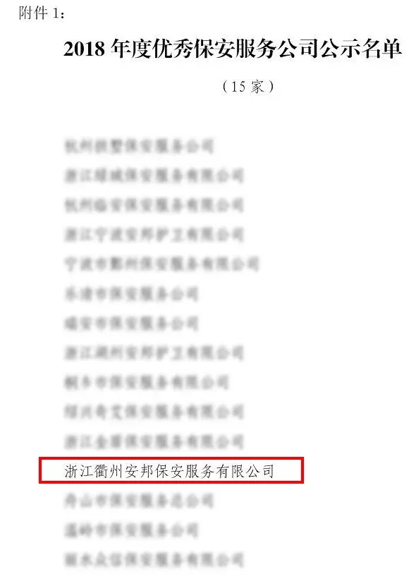 热烈祝贺浙江衢州安邦保安服务有限公司被浙江省保安协会评为“2018年度优秀保安服务公司”。衢州安邦保安公司员工许建丽被评为“2018年度优秀保安员”。