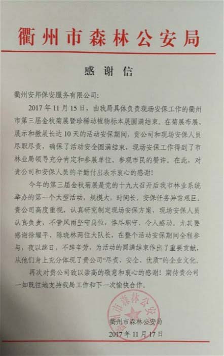 11月5日-15日,第三届金秋菊展暨珍惜动植物标本展圆满落幕,本次活动由浙江衢州安邦保安服务有限公司全程负责安保服务。此次活动规模大、时间长,安保任务异常艰巨。安邦保安公司高度重视,认真研究制定现场安保方案。现场安保工作得到了市林业局领导和参展单位的充分肯定。现场安保人员坚守岗位、不惧风雨、夜以继日、不辞辛劳的精神令人感动。市森林公安局专门发来感谢信,并表示期待更广泛、更深入的合作。