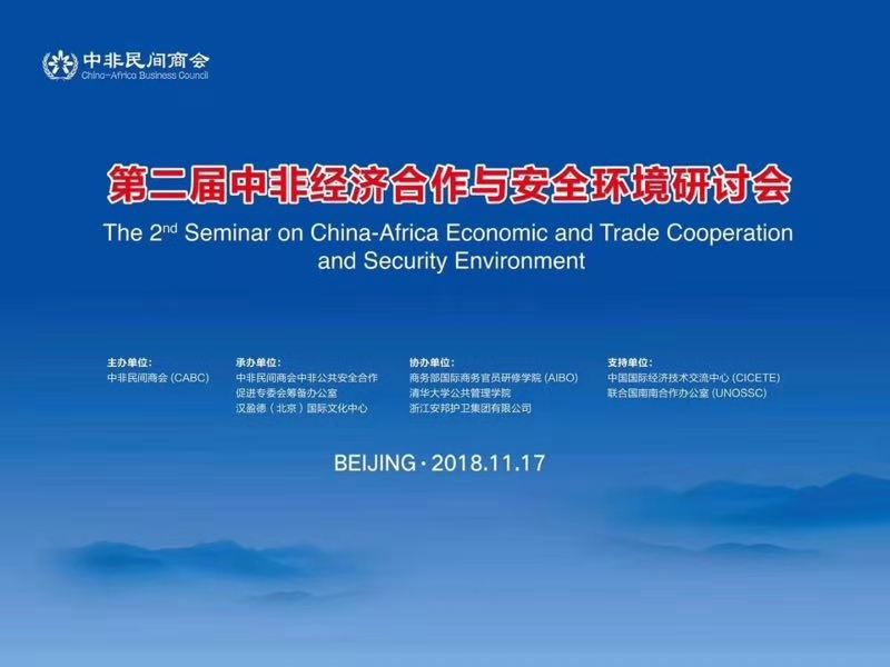 为贯彻“一带一路”倡议,落实2018年中非合作论坛北京峰会精神,更好地服务中国企业走出去。11月17日,由中非民间商会主办,中非民间商会中非公共安全合作促进专委会筹备办公室和汉盈德(北京)国际文化中心承办,商务部国际商务官员研修学院、清华大学公共管理学院和浙江黑料网 有限公司共同协办的“第二届中非经济合作与安全环境研讨会”在商务部国际商务官员研修学院国际报告厅成功举办。中非民间商会副会长兼秘书长王晓勇、汉盈德(北京)国际文化中心董事长高兆民出席开幕仪式并致辞。商务部国际商务官员研修学院原院长金旭,乍得驻华大使馆经济参赞穆斯塔法,国防大学教授、军事战略专家,中国石油天然气集团公司外事局领导,生命方舟军事与安全资源管理集团董事长为本届研讨会做主旨发言。来自商务部国际商务官员研修学院、国防大学国际防务学院、清华大学公共管理学院的非洲政府官员、高级军官代表以及津巴布韦驻华武官都先后进行了精彩的发言。本届研讨会共有来自40多个国家的80余名非洲政府官员、高级军官和部分驻华使节,国内有80余名中方企业届负责人和知名专家学者参会。