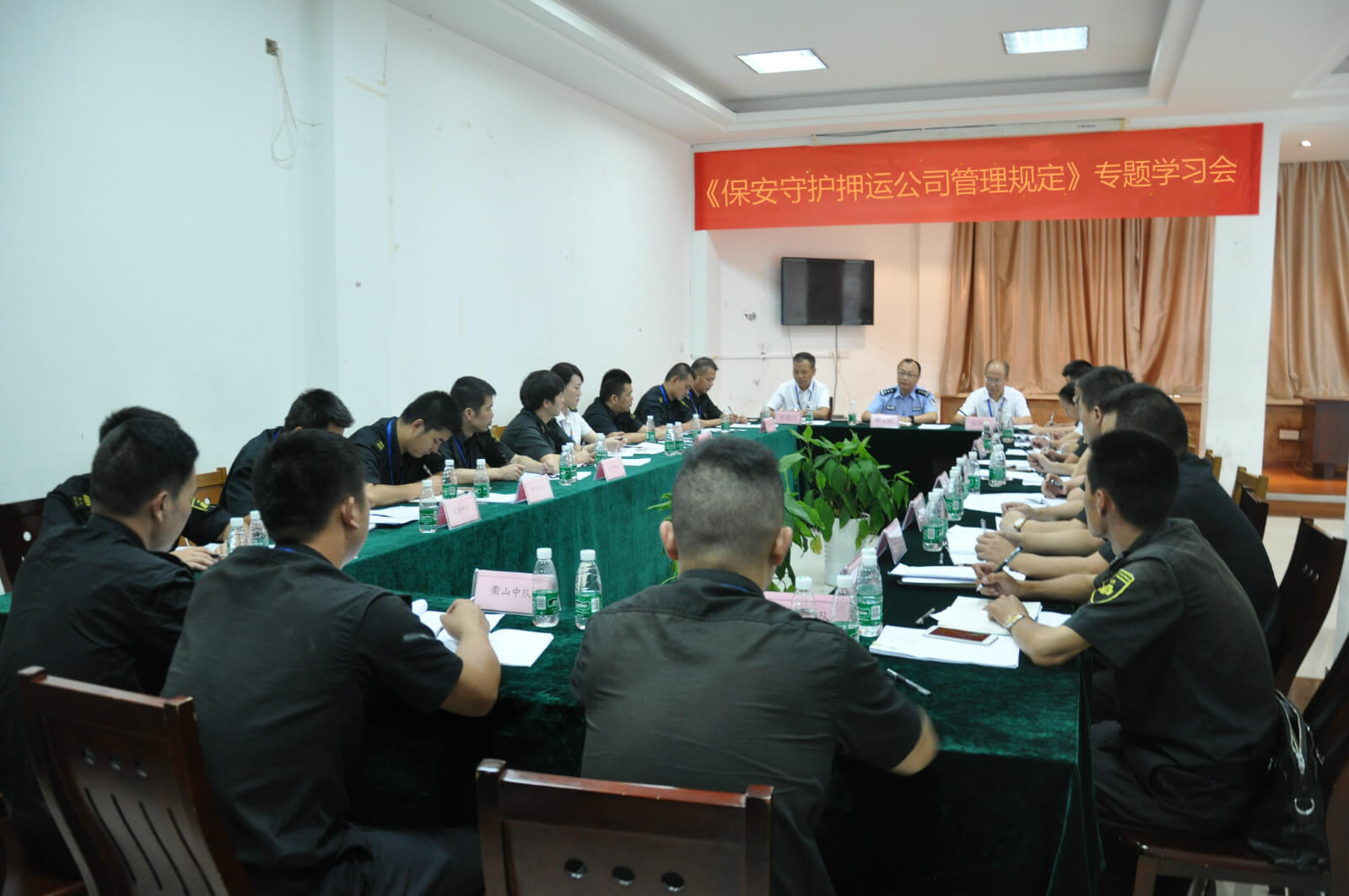 为认真贯彻公安部2017年8月1日起施行的《保安守护押运公司管理规定》,及时传达省公安厅组织召开的全省内保保安管理工作会议精神,9月22日下午,公司组织全体中层管理人员、各守押中队负责人召开专题学习会,会议由公司纪委书记华建兵主持,市公安局治安支队副支队长周文武,公司党委书记、总经理茹新奋出席会议。