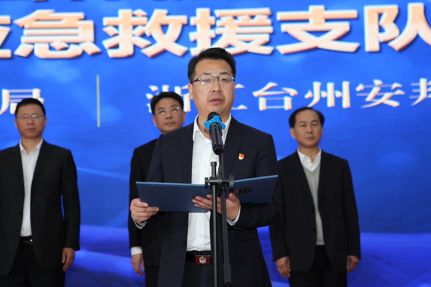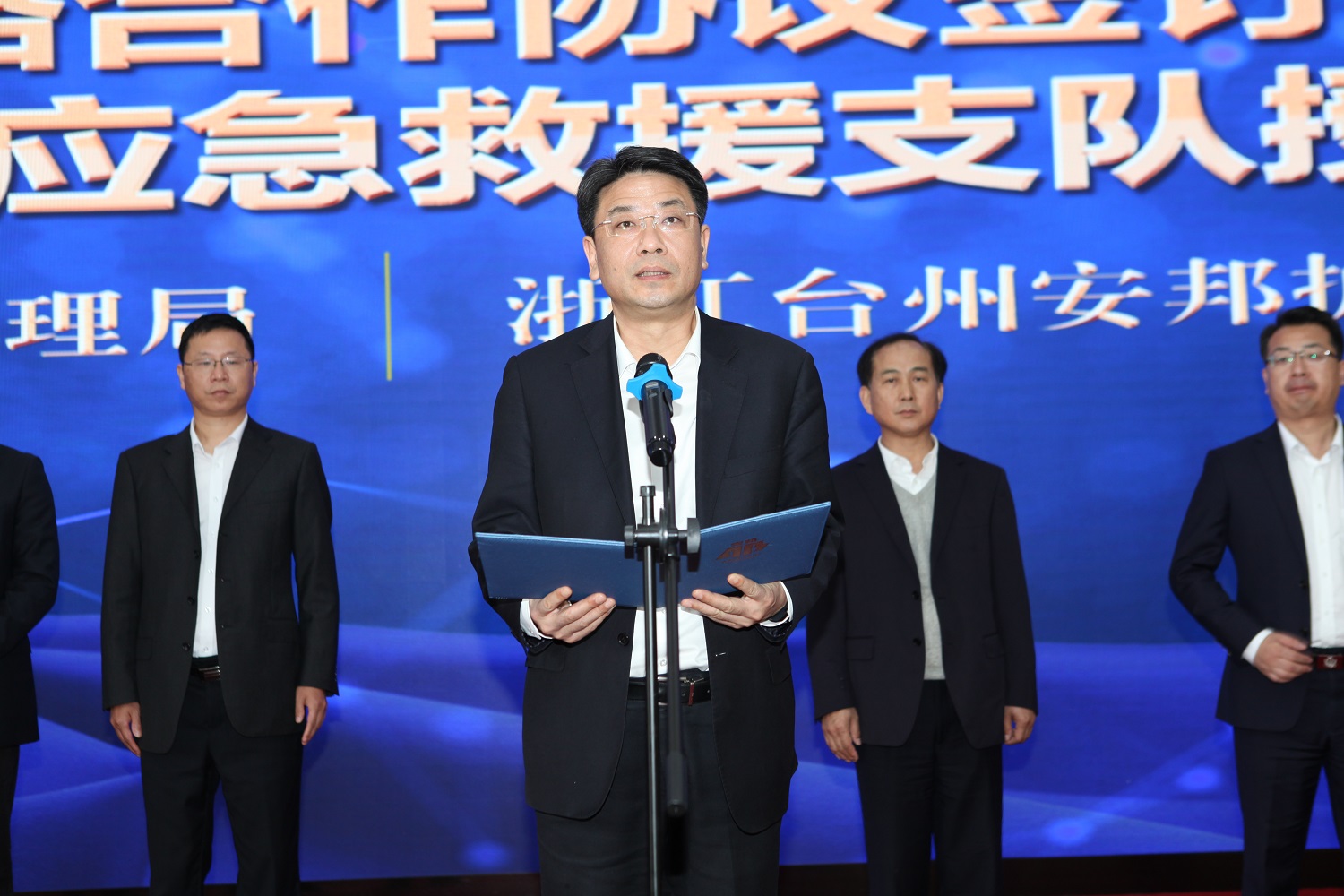 台州市应急管理局党委书记、局长李斌为台州黑料网 应急救援支队授旗并讲话。