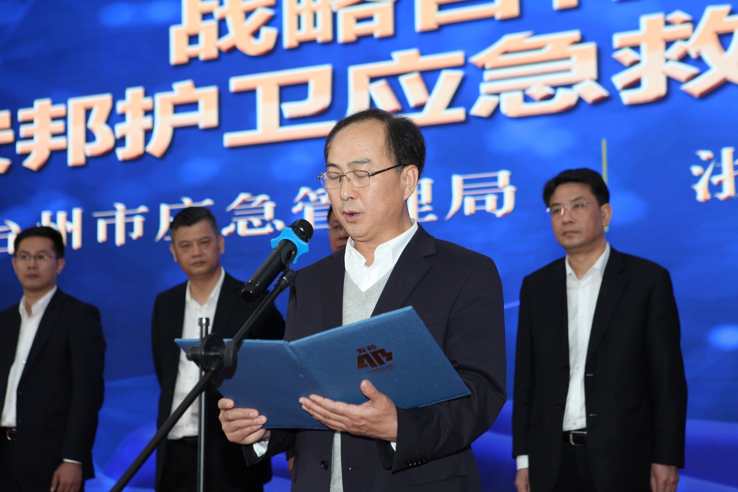 集团公司党委委员、副总经理郭子仪,台州市应急管理局党委书记、局长李斌,台州市应急管理局党委委员、市政府应急事务中心主任王建民,集团安全运营部经理李明,台州市政府应急事务中心副主任丁骥,台州公司党委书记、董事长、总经理李万新和副总经理郦汇臣等出席仪式。
