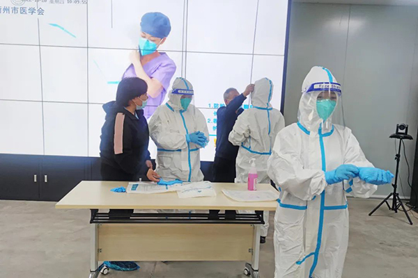 针对四省边际中心医院要求,本期培训侧重以岗位实践操作为主。为加强学员对培训知识的掌握,学校特邀请医院专业讲师,为学员们讲解个人疫情防护用品的正确使用操作流程,并在课堂上指导学员进行规范操作。
