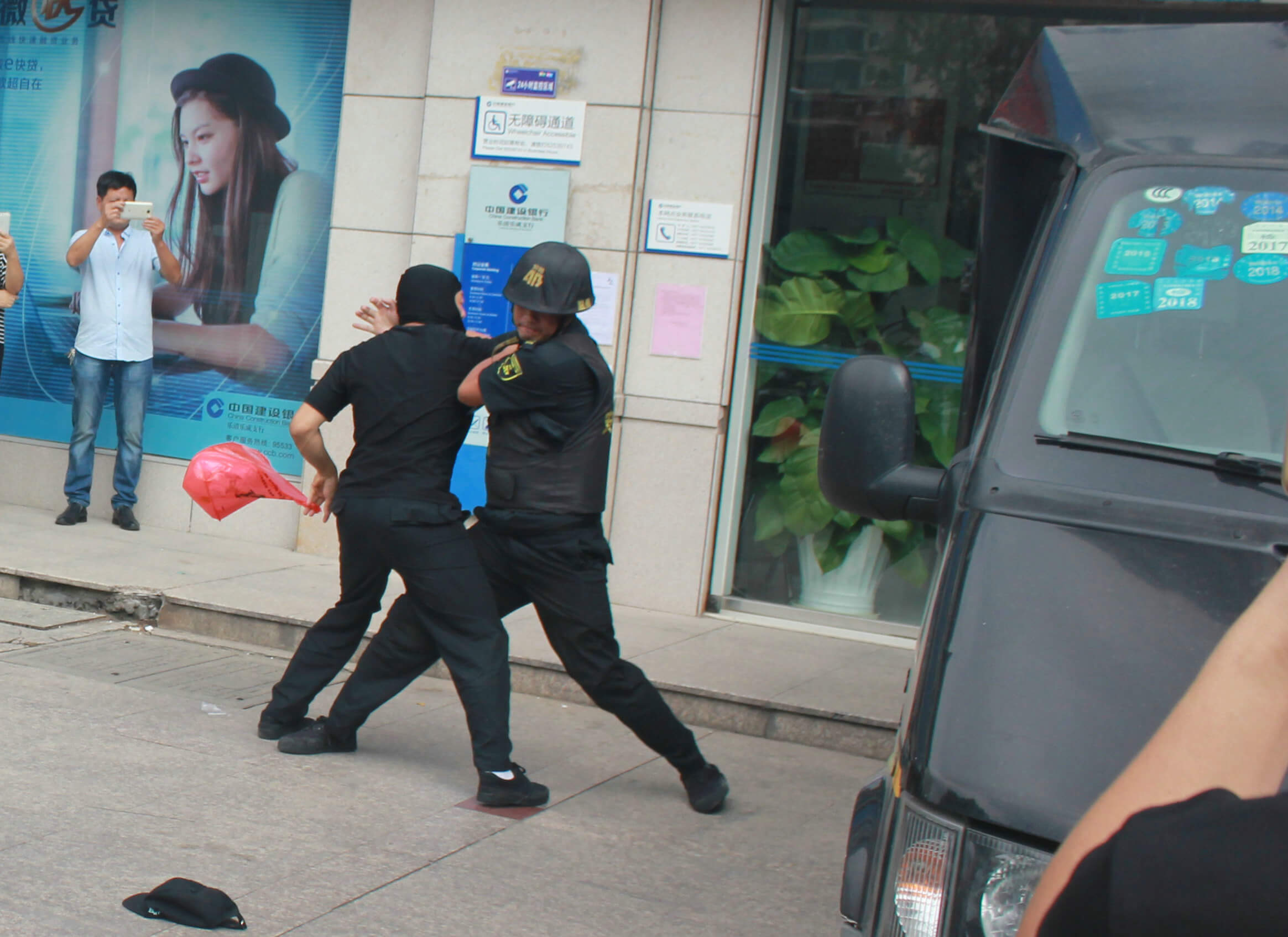 9月24日上午9时,两名身份不明人员到达建行乐成支行网点,避开银行保安人员的视线,四下窥视,形迹可疑。9时38分,温州公司乐清大队浙CAX868车组抵达银行网点,就在运钞车交接员打开尾箱门,提取款箱之际,事先隐藏在周边的两名不明身份人员闯入押运警戒区。