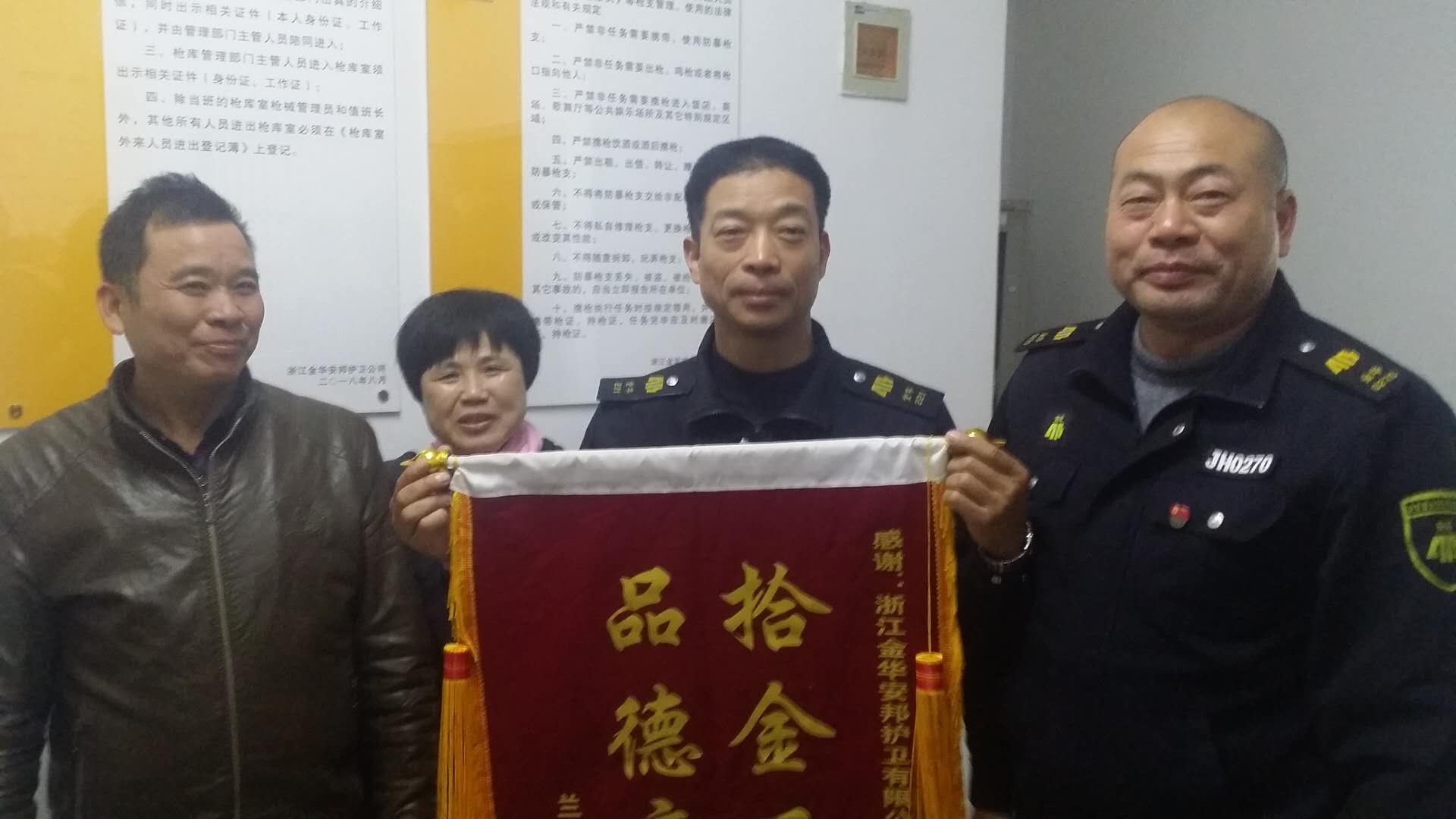 12月10日上午,兰溪市民徐女士将一面印有“拾金不昧 品德高尚”的锦旗送到金华安邦公司江南大队兰溪农商行中队车长洪国奶手中,感谢他拾金不昧,物归原主。经核实,12月7日,该中队车长洪国奶上班途中捡到皮包一只,内有手机及现金票据等。他主动向中队汇报,并及时联系失主,最终物归原主。充分体现了安邦队员文明高尚的品德作风,也展示出了安邦公司的良好形象。