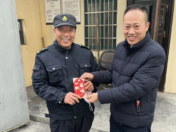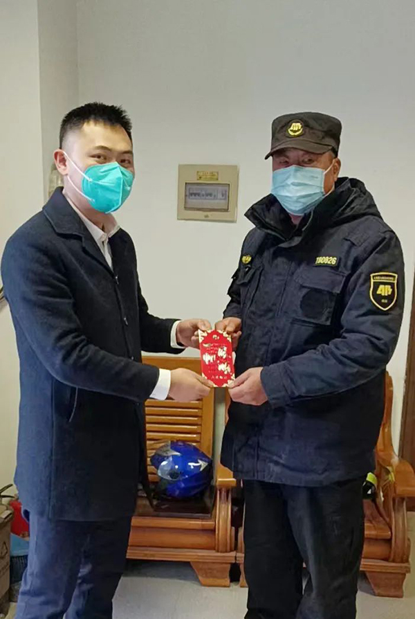 党委委员、副总经理郑胜,安邦保安公司总经理席霞、副总经理金国飞来到客户单位安保值班室,对春节期间舍小家为大家,奋斗在一线岗位的保安员表示感谢,嘱咐大家要合理安排工作与生活,注意保暖,保护好自己才能守护好万家灯火,并通过他们向各自的家庭送去公司的关心和祝福。