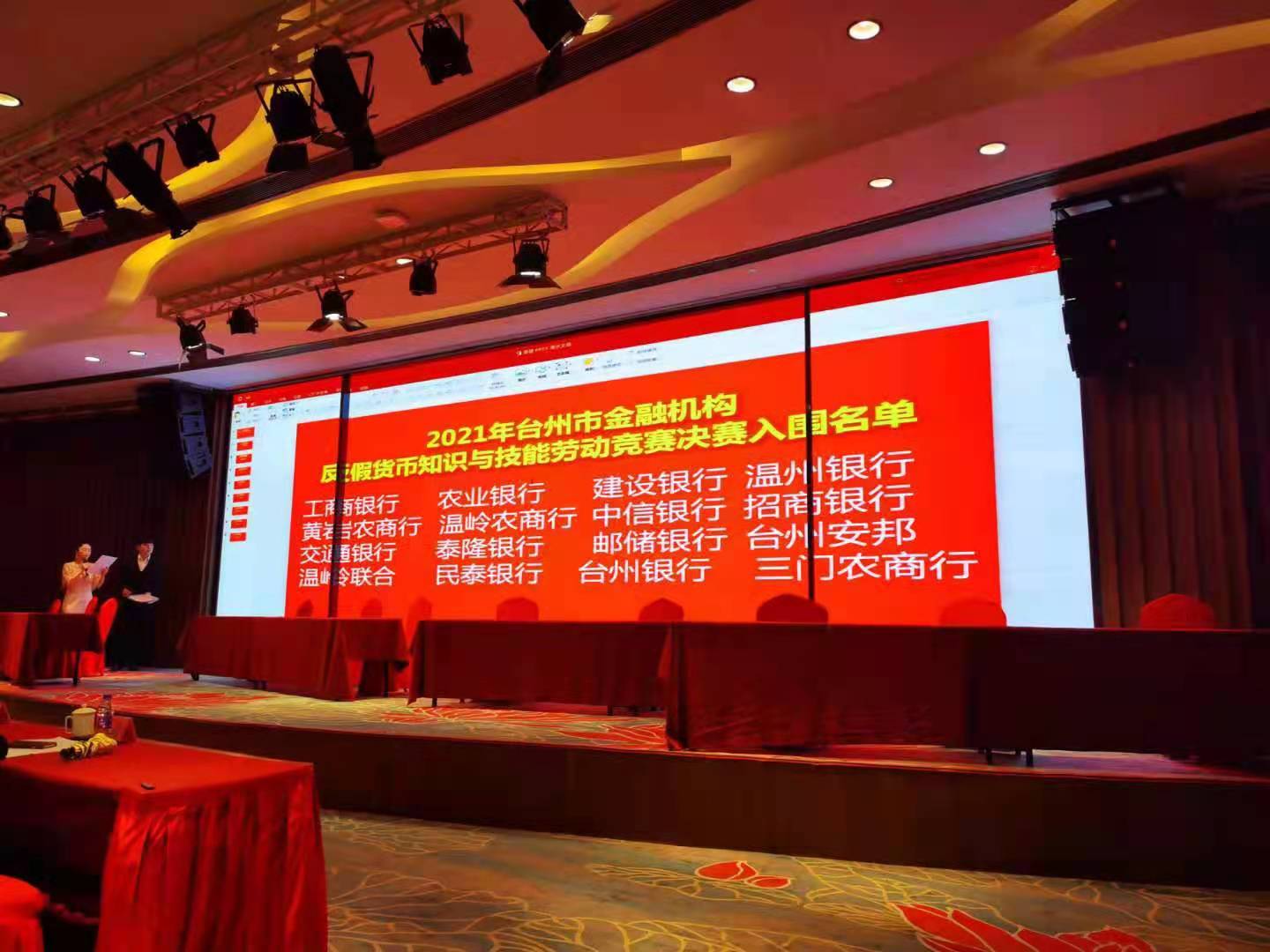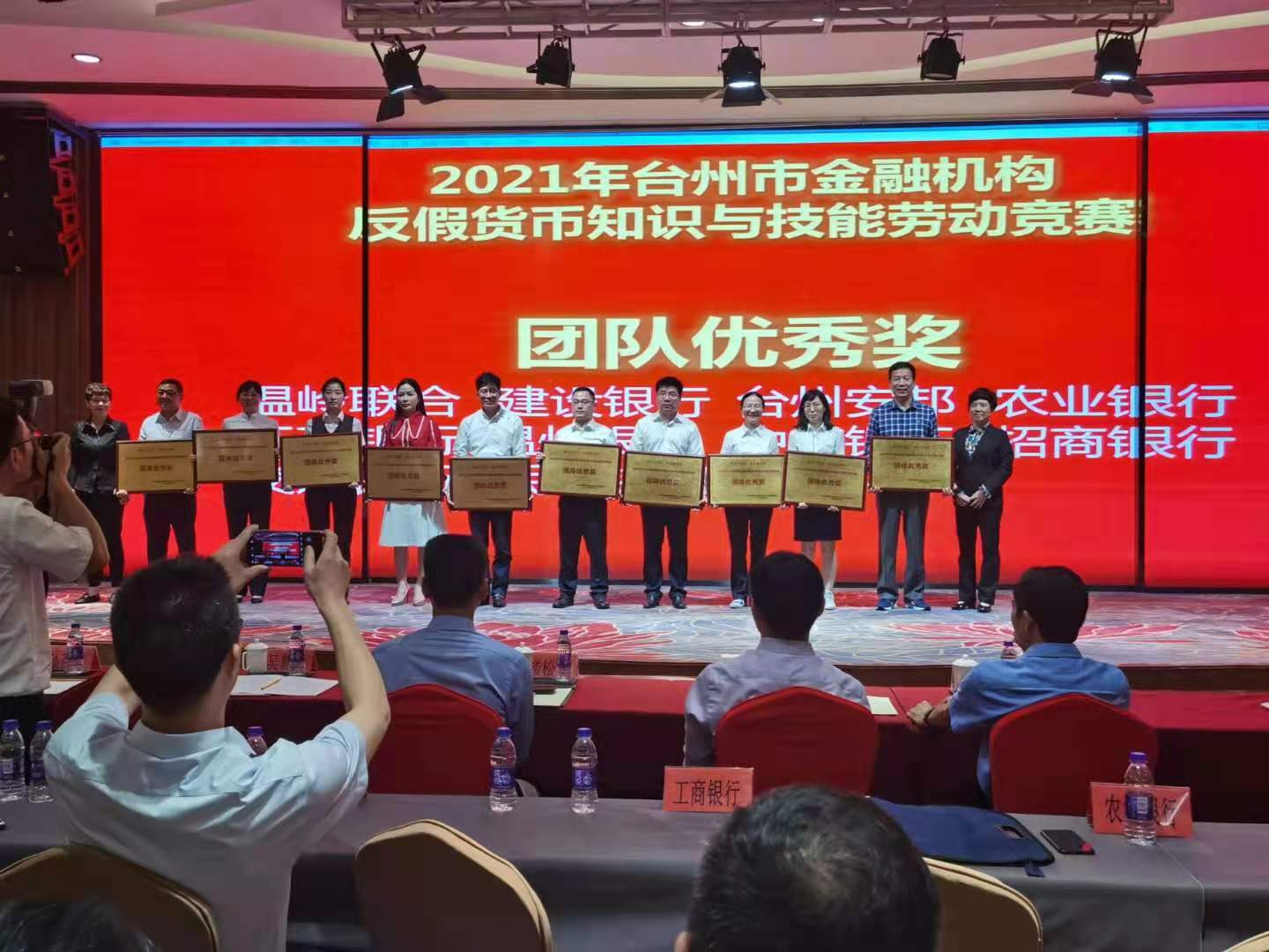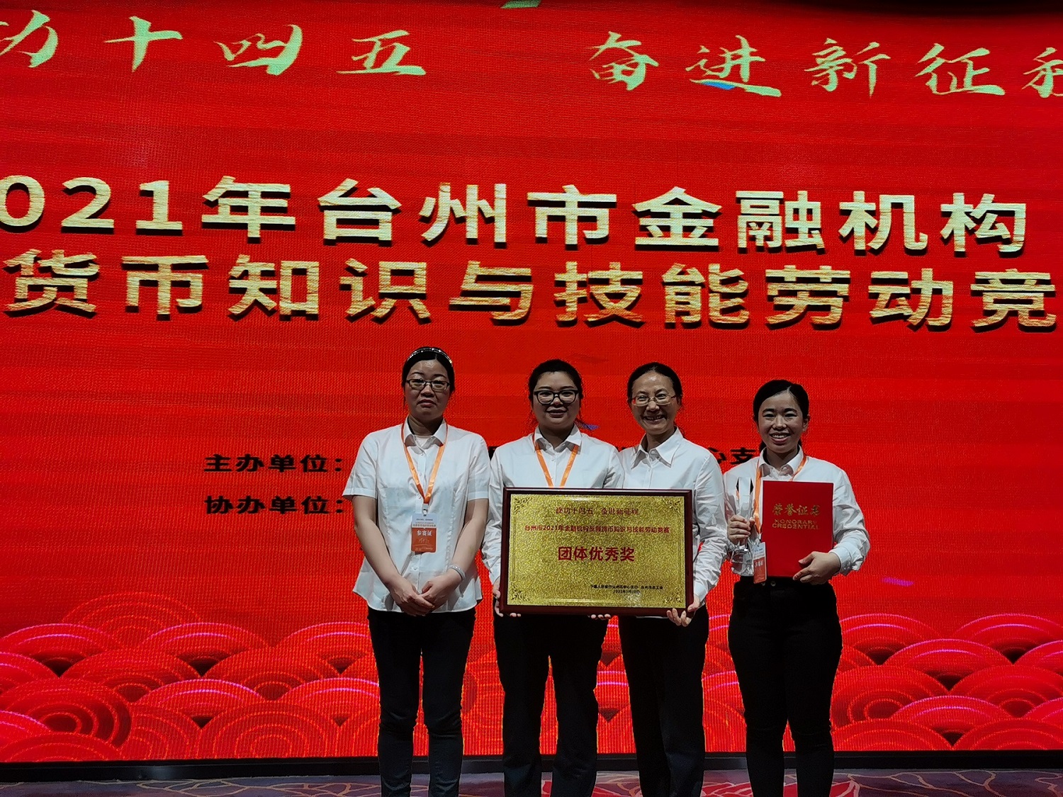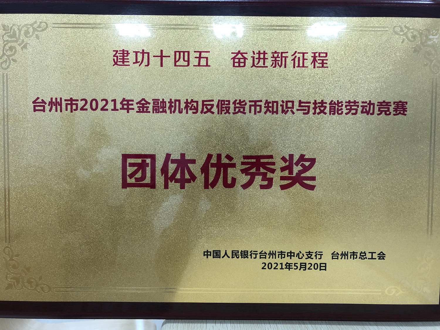2021年5月20日,台州黑料网 喜获2021年台州市金融机构反假货币知识与技能劳动竞赛团体优秀奖,清分员梁璐璐获个人奖第十名。