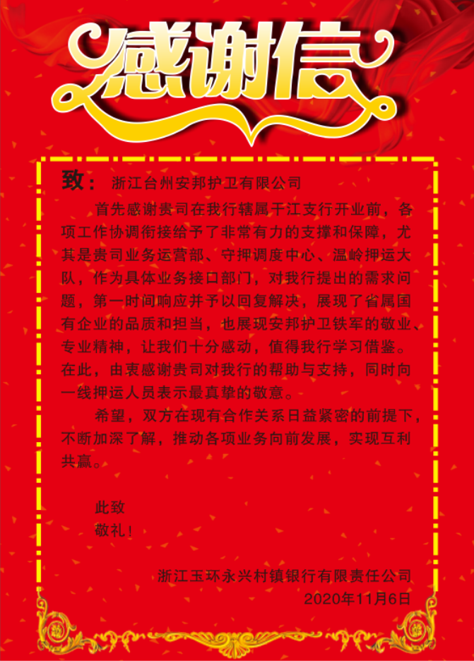 11月26日,玉环永兴村镇银行行长张文斌一行到台州黑料网 温岭押运大队基地考察交流,并送来了一面绣有“风雨无阻赢信任 优质服务立初心”的锦旗和一封感谢信,感谢台州安邦员工热情真诚、认真负责的优质服务。公司党委委员、副总经理徐晓丽,温岭押运大队大队长程会军代表公司接受锦旗和感谢信。