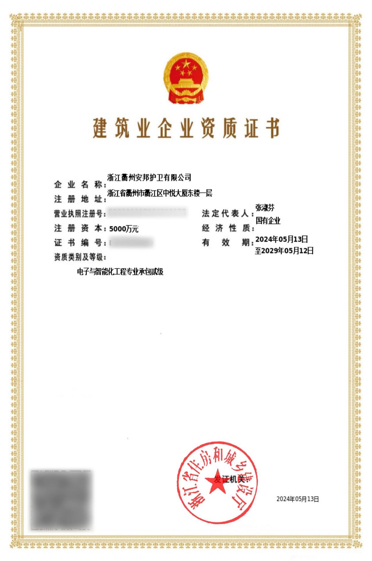 有限公司成功取得浙江省住房和城乡建设厅颁发的电子与智能化工程专业承包贰级资质。