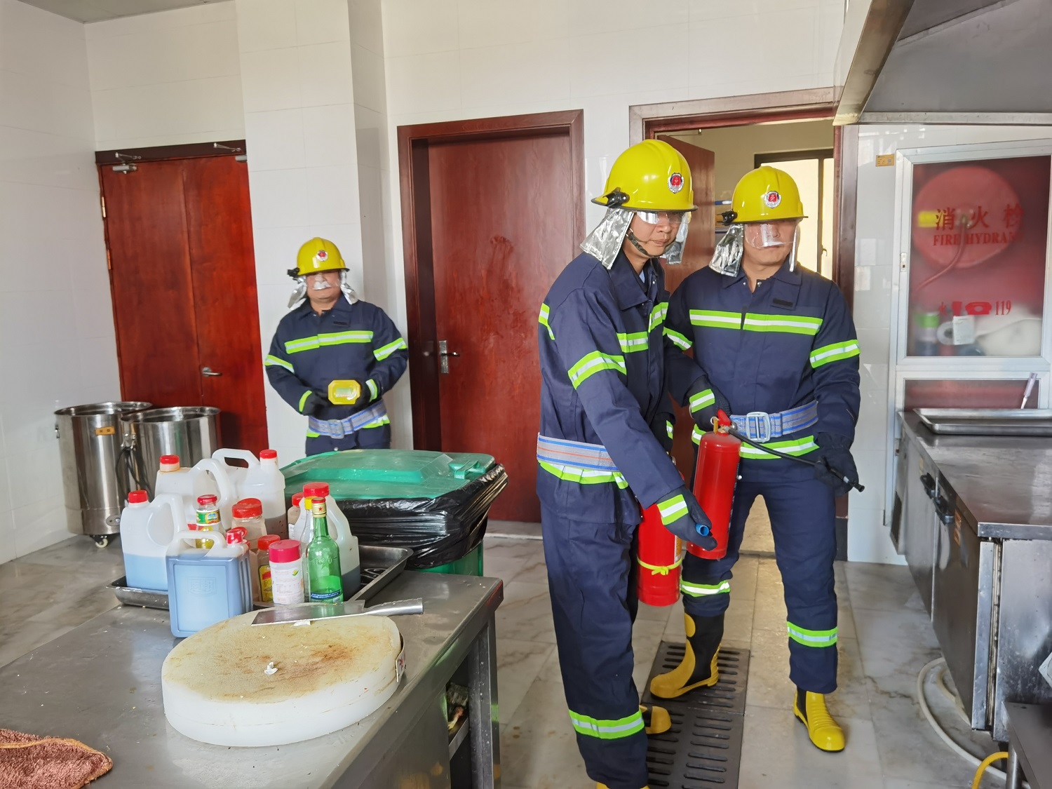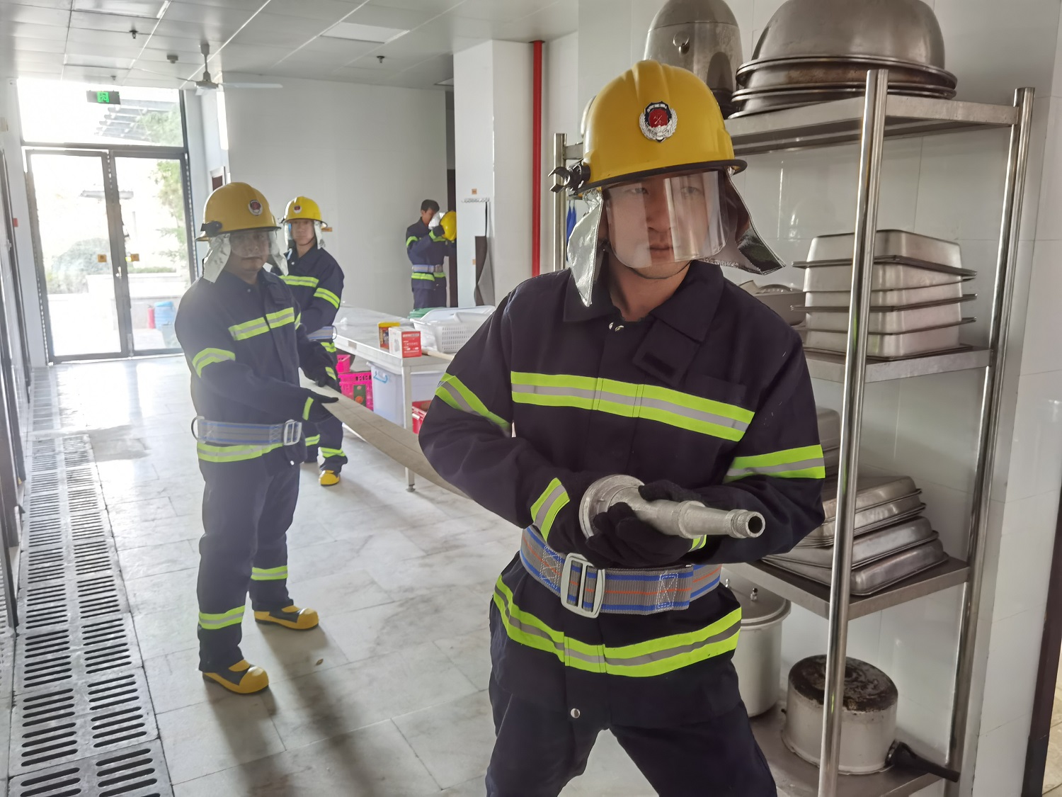 消防演练模拟公司食堂厨房由于操作不当发生火情,蔓延的火势对公司物资、人员财产安全构成威胁。收到警情信息,微型消防站成员立即启动灭火演练应急预案,根据一分钟出动、三分钟到场、五分钟处置的原则,队员们快速着装,配合行动。