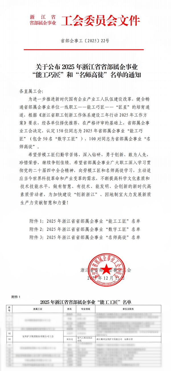 有限公司科技防护部运维主管宋自文成功入选2025年浙江省“能工巧匠”名单。