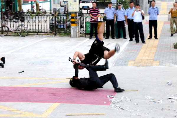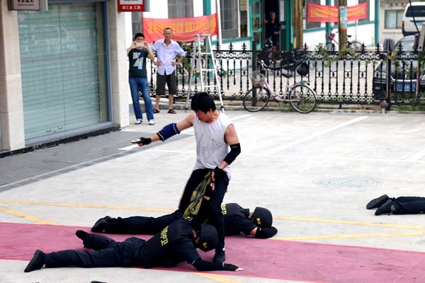 演练模拟晚收交接时,突遇“歹徒”实施持枪抢劫活动, “歹徒”趁守押队员交接完成准备上车时,抛出自制爆炸物,并持枪击伤交接员后抢夺款包,车长快速反应,迅速装弹,果断射击击倒一“歹徒”,其他队员同“歹徒”搏斗,最终制服其同伙。驾驶员在听到爆炸声后,驶离现场,向110、120报警,同时向公司汇报,公安人员接到报警后迅速出动,现场得到控制后,银行工作人员也将款箱安全转移到网点里面。最后,持枪抢劫“歹徒”被公安人员带离现场,演练取得圆满成功。