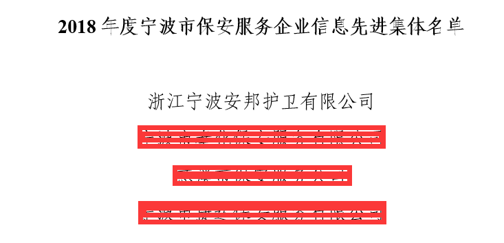 2月22日,宁波安邦公司被宁波市保安协会表彰为2018年度保安服务企业信息先进集体,至此,在2018年,该公司先后喜获省保协“优秀保安服务公司”“省级平安单位”“先进保卫组织”等八项荣誉。