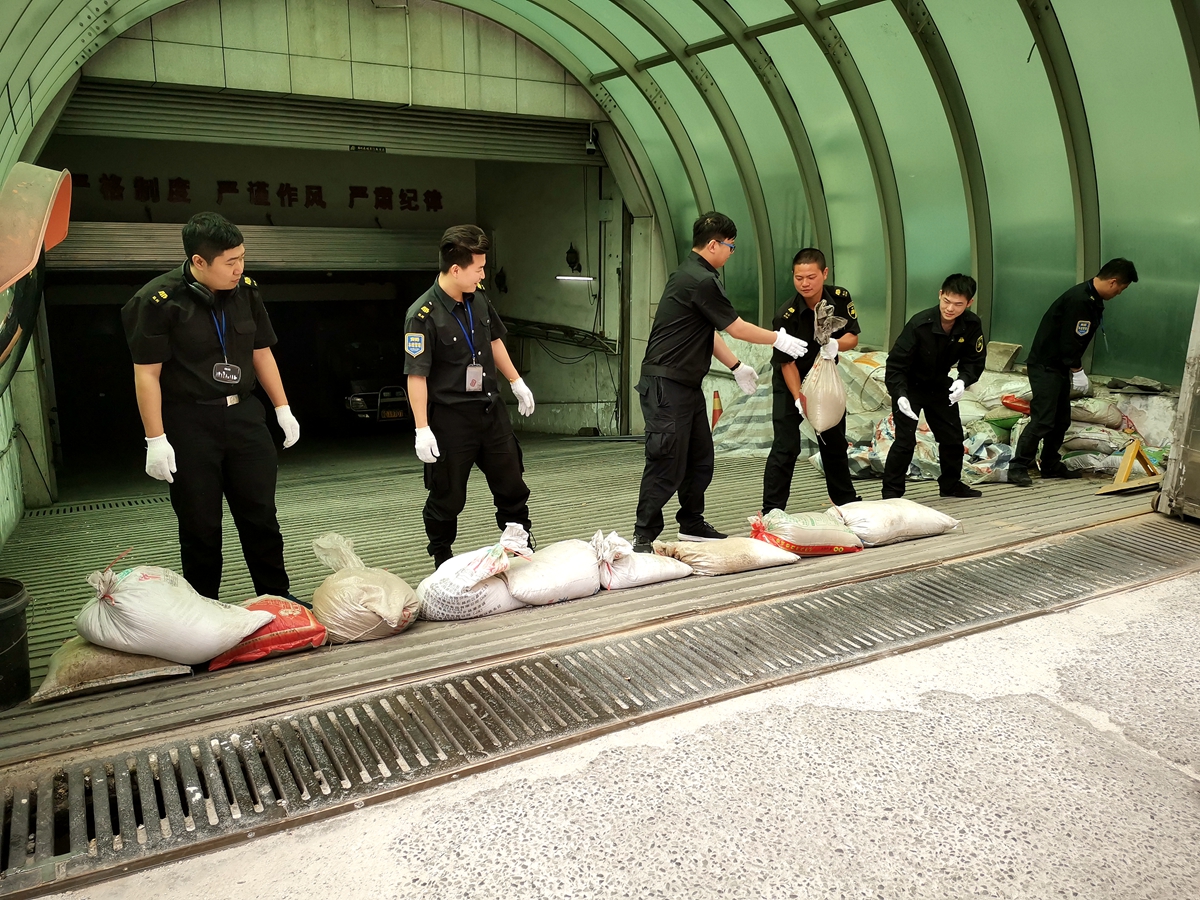 此次应急预案演练场景为突遭暴雨,金库面临被水淹危险,抢险小组根据现场水灾情况速度开展救援,开启排水泵,并用沙袋堵住地下室出入口大门,防止雨水灌入,经过防汛抢修,演练圆满完成。