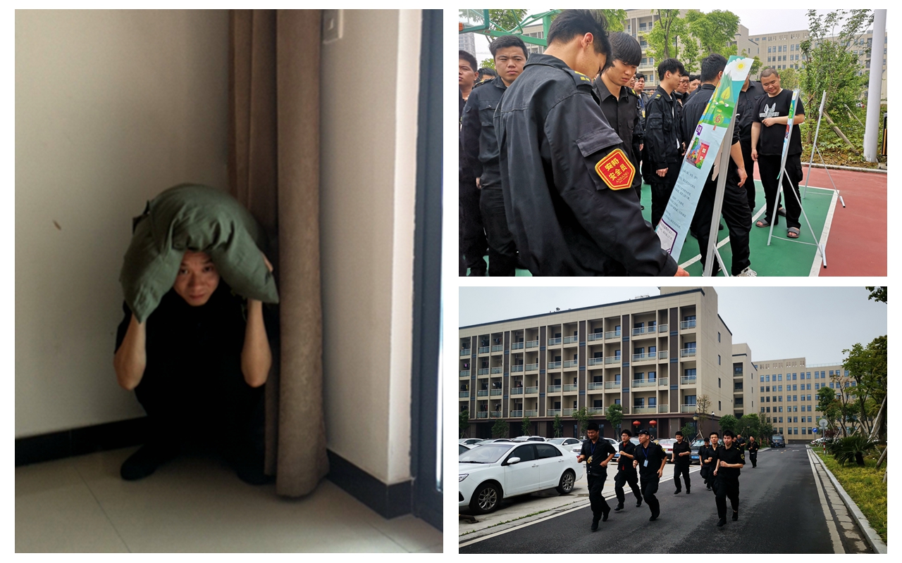 活动开始前,大队组织员工观看防震救灾知识活动展板,让员工了解相关知识。演练开始后,应急值班人员发出地震警报, 寝室楼的员工立即就地躲避在三角区或内墙角等牢固地点,用棉被、枕头等柔软物保护头部,等地震减弱后,快速、安全、有序地撤离到指定区域。
