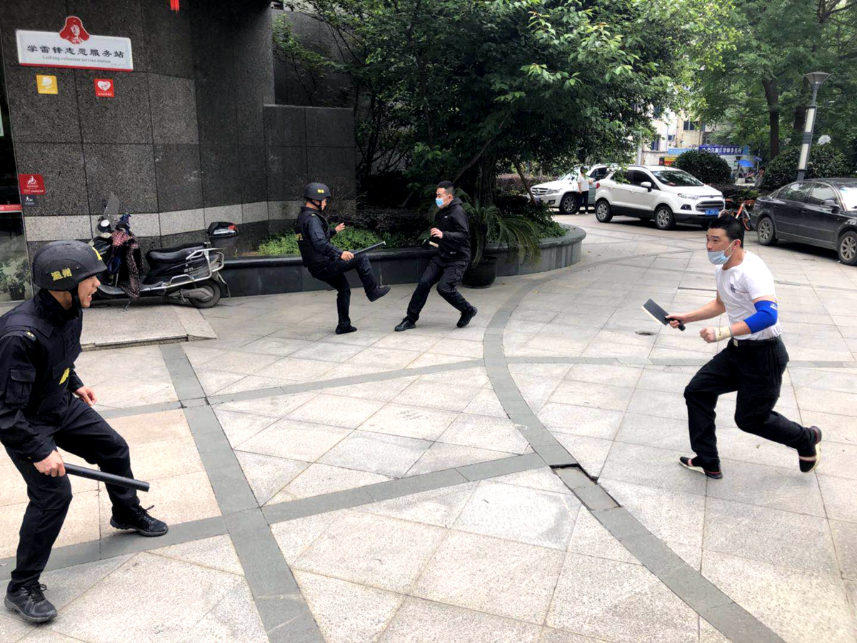 演练模拟交接时,突遇“歹徒”实施持刀抢劫活动,队员按照预案流程组织应对,运用擒拿格斗术成功制服“歹徒”,做到遇到紧急情况各负其责,圆满完成了演习任务。