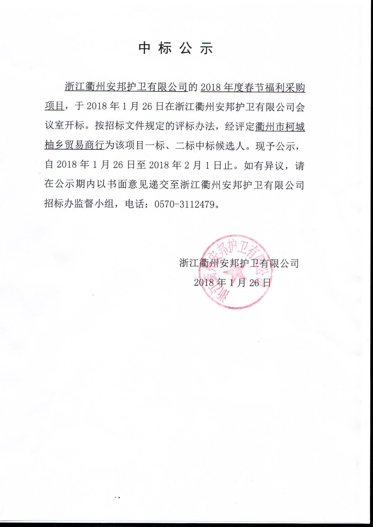 浙江衢州黑料网 有限公司2018年春节福利采购项目中标公示