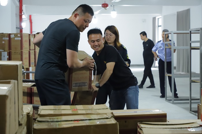 5月12日下午,浙江嘉兴黑料网 有限公司由党委委员、副总经理胡公钏带队,派出5个车组,共计25名队员,前往嘉兴市公安局南湖区分局,将第二批涉案财物——查获的假冒伪劣高端白酒顺利运回涉案财物管理中心,共计660余箱,包括酒类4500余瓶,生产辅料62箱、灌装器皿209箱、设备2台。所有涉案财物均被一一登记入库,妥善保管。