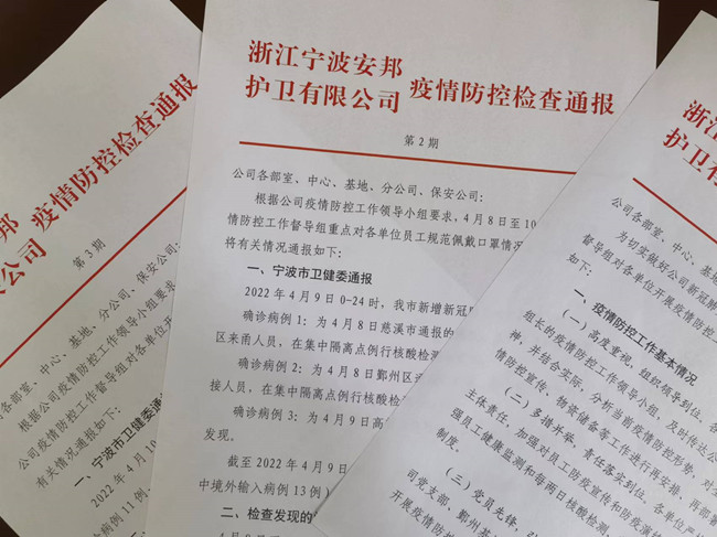 公司督导组打开检查督导“千里眼”。为确保公司疫情防控和业务稳定“两战赢”,督导组利用车载监控视频、现场临时督查等方式,提醒员工做好办公防护。还编印《疫情防控检查通报》,提醒全体员工不掉链子、不放松,为宁波金融守押市场安全平稳运行贡献力量。