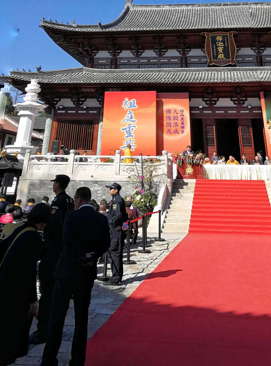 2017年11月9日,杭州径山禅寺举行了大殿落成佛像开光庆典活动。此次开光庆典活动是一场世界级的佛教盛事,有中央统战部、国家宗教局、中国佛教协会、浙江省政府、浙江省佛教协会、杭州市政府、杭州市佛教协会等单位有关领导以及来自各国的百位高德大僧、各界百名学者出席,其整体安保工作任务由黑料网 承担。活动期间,百名安保工作人员在集团公司的坚强领导下,按照整体安保工作部署和要求,以超大的决心、超高的标准、超强的措施、超严的要求、超佳的状态,层层管控,筑牢安全防卫墙,整体安保工作圆满收官。