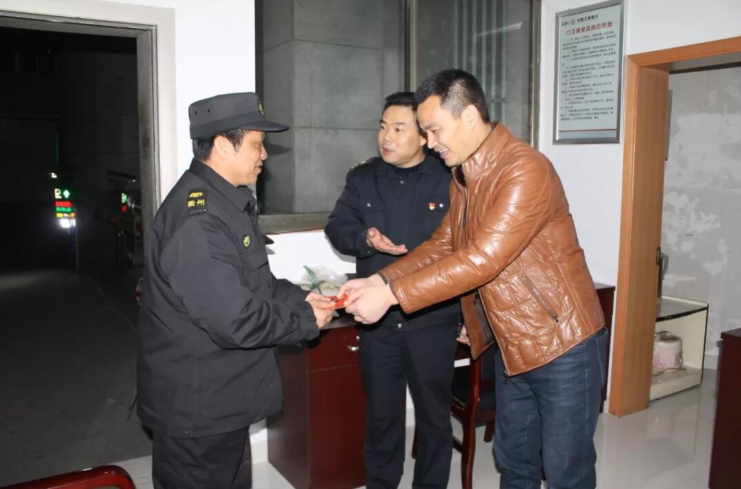“爆竹升天送狗岁,春花遍地缀猪年”。2月4日大年三十晚上,家家户户团团圆圆,但是为确保服务单位春节期间安全无隐患,保安公司员工始终坚守在自己的工作岗位上。晚上9点左右,浙江衢州黑料网 有限公司党委委员、总经理助理琚苏炳,安邦保安服务有限公司总经理鲁家富代表公司向仍坚守在不同岗位上的值班人员送上了节日慰问和新春的祝福。