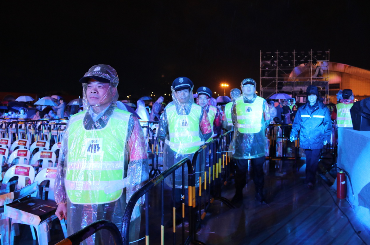 作为举办方——综合实力跻身全国50强开发商的中梁地产,在活动期间邀请了张卫健等大牌歌星,参演阵容强大、活动规模空前,对现场保卫提出了高标准、高要求。为确保活动期间的安保重任,安邦保安公司高度重视,经过实地勘察,制定专项安保方案和模拟应急预案演练等充分准备,共计出动300余名安保人员(含特保大队)负责现场保卫工作。下午16:30,队员们到达保卫现场,这时,天空下着毛毛细雨,队员们不畏严寒,或蹲着、或站着吃起盒饭。17:10队员们在公安和公司领导的现场指导下各岗位就位。18:10,随着观众的陆续到来,现场开始忙碌起来:检票、安检、进场秩序维护……,19:05盛典开始,保安员们或戴雨衣、或打伞坚持在岗位上。21:00盛典结束,全程4小时,鞋子、裤子全湿了,而队员们并没叫苦叫累。因为,确保安全有序是对队员们最大的心愿。