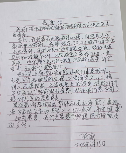 平凡岗位见真章,危急时刻显担当。近日,温州安邦安全科技服务有限公司收到一封来自沙城街道居民陈瑜的感谢信,字里行间满是对公司安保队员吴春香专业素养与无私精神的赞誉。一场突发火情,一次果敢行动,不仅守护了群众财产安全,更传递了国企安保人的责任与温度。