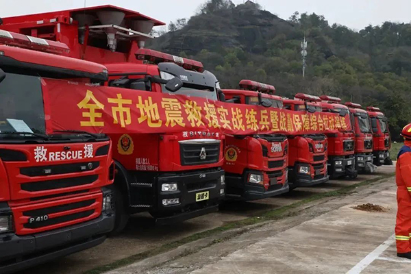 演练模拟某地发生7.0级地震,震中一水泥厂建筑倒塌损毁严重,大量人员被埋压,进入震中的道路交通阻断、电力中断、公网通信设施瘫痪、车辆无法通行。