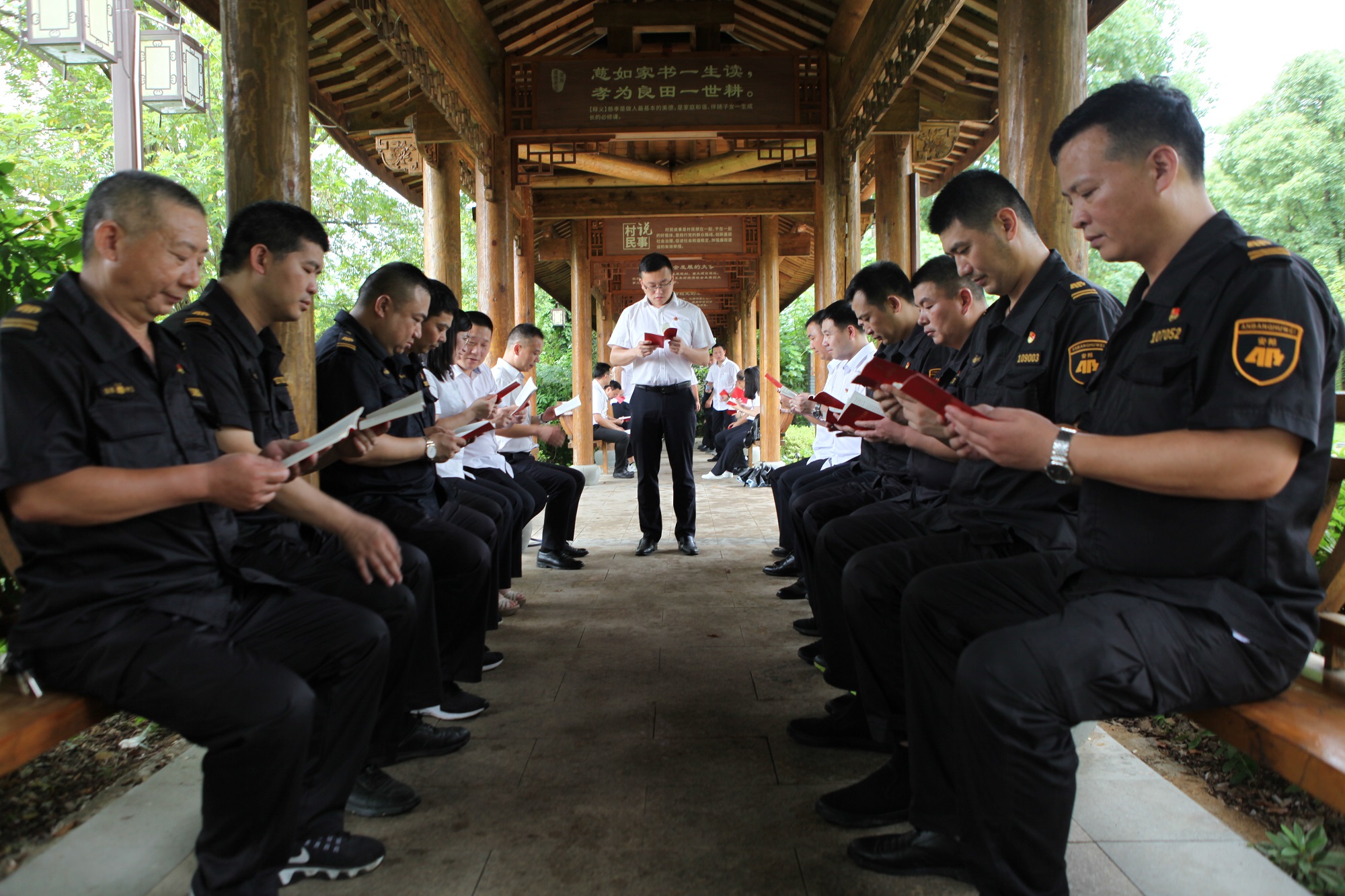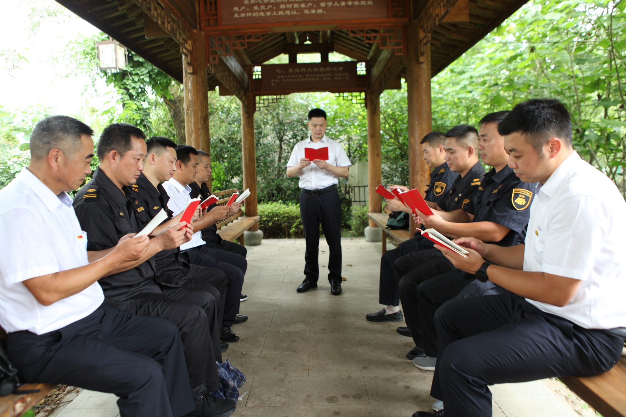 在横坎头村民说事亭中,党员们学习《党章》等内容,并进行集体讨论。通过学习夯实理论基础,提升党员修养,增强思考能力,提高业务水平。