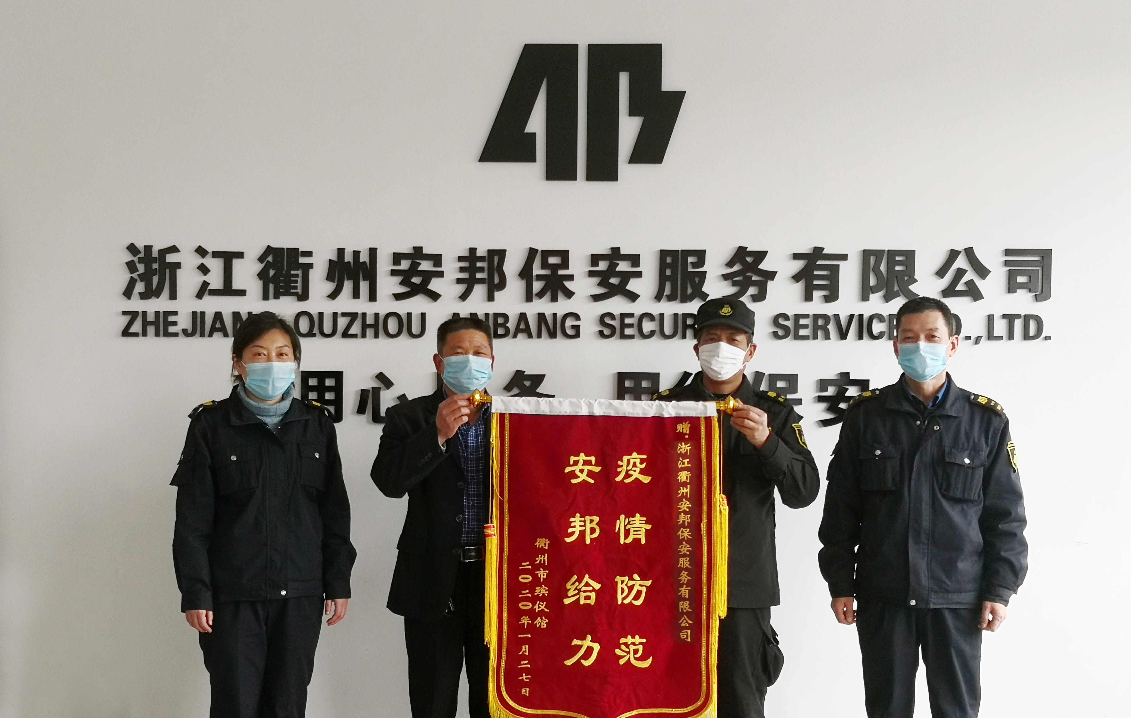 2月25日下午,衢州市殡仪馆办公室主任祝水根,将一面写有“疫情防范 安邦给力”的锦旗,送到了衢州安邦保安公司,保安公司衢江大队大队长徐云生代表公司接过锦旗,这面锦旗是服务单位对保安公司疫情防控工作的最好赞许。