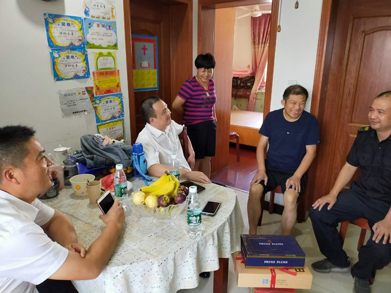 江北基地,工会小组一行分别前往汪春元、吕云海员工家里,为他们带去公司的关怀之情。汪春元一名工作出色的中队长,因患腹膜炎院期间,仍不忘工作,通过微信及时传达工作任务,衔接客户;吕云海是一名入职11年的老员工,58岁的他依旧坚守在工作一线,因一场突如起来的车祸造成伤病,队领导及时前往探望,并经常电话了解伤情情况。