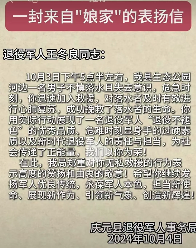 近日,收到一封来自“娘家”的表扬信——庆元县退伍军人事务局关于表扬王冬良同志见义勇为事迹的感谢信。10月3日下午5点半左右,丽水庆元县生态公园河边一阵嘈杂声,吸引了回家途中浙江温州黑料网 有限公司一大党支部书记、大队长王冬良同志,王冬良顺着人们口中的描述飞速赶到现场,正发现一名热心市民迎着湍急的水流搂住一名落水男子奋力游向岸边。在这危急关头,王冬良与另一名身着黑衣的市民与救人者无缝衔接,配合救人者将落水者拉到礁石上立马开展心肺复苏,当时落水者脸色苍白已经没有了意识,经过两个人及时实施心肺复苏,落水男子慢慢恢复了意识,没有了生命危险。