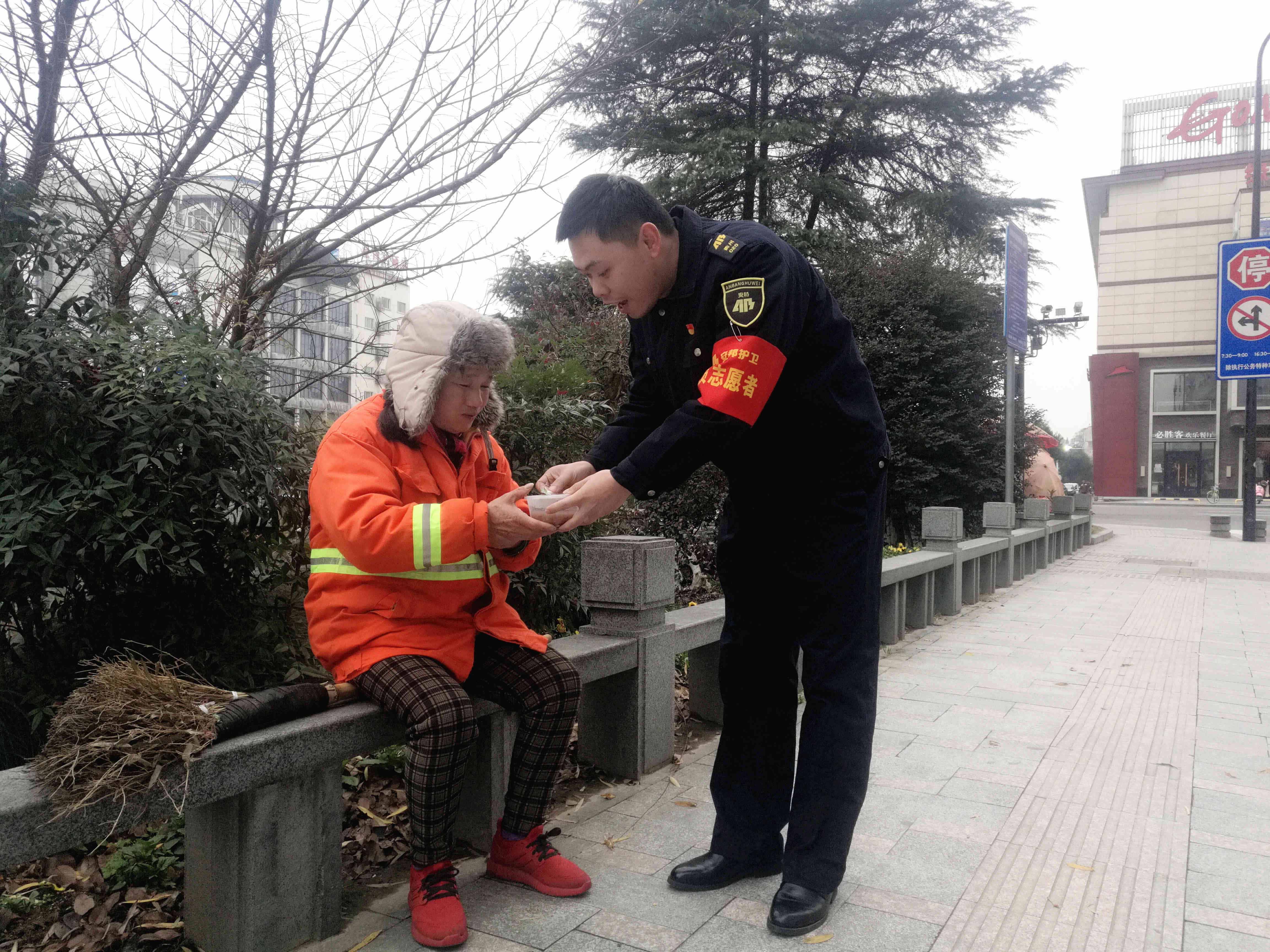 党员志愿者们先后来到文明示范街——上下街及周边街道,为忙碌在工作岗位上的环卫工人、交警、公安、城管等工作人员送上热气腾腾的粥品。他们吃着香甜的腊八粥,脸上洋溢着幸福的笑容。