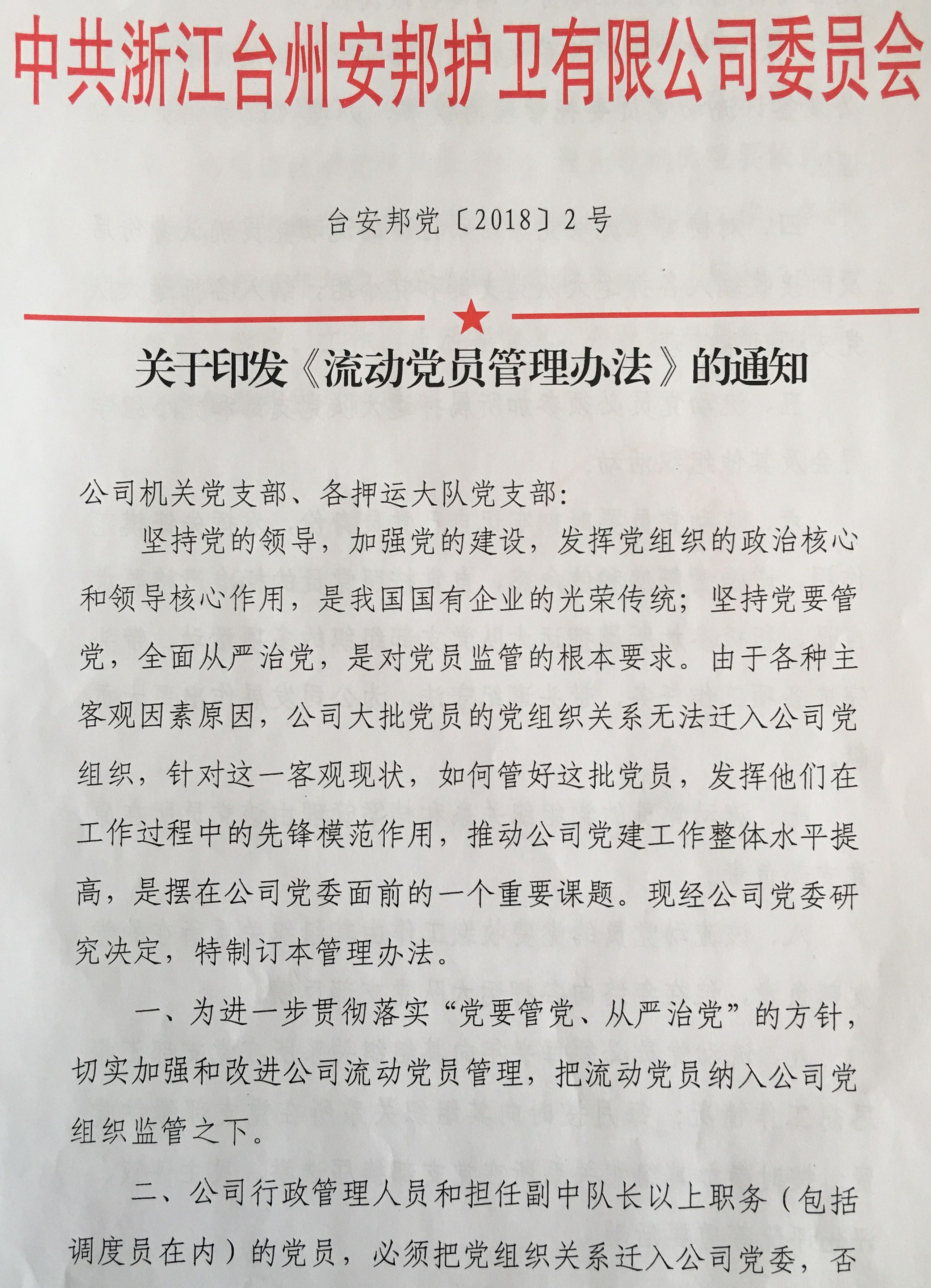 公司直属押运大队党支部创建“流动党员归心工程”品牌,以“九个一”为抓手积极探索流动党员管理新模式。支部现有流动党员77人,创建目标是把流动党员纳入支部正常管理范围,进一步规范流动党员管理机制,发挥他们先锋模范作用。