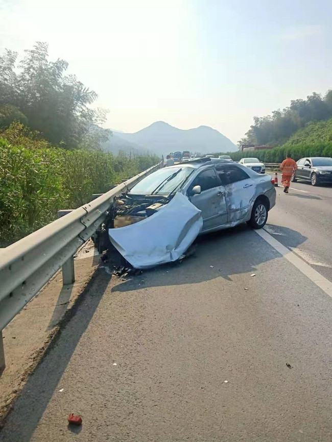 93日上午,宁波公司象山分公司党支部书记朱海挺驾车行经甬台温高速塘溪路段时,突然发现一辆货车停在慢车道,一辆卡罗拉私家车撞上了在高速护栏,车头已严重变形。