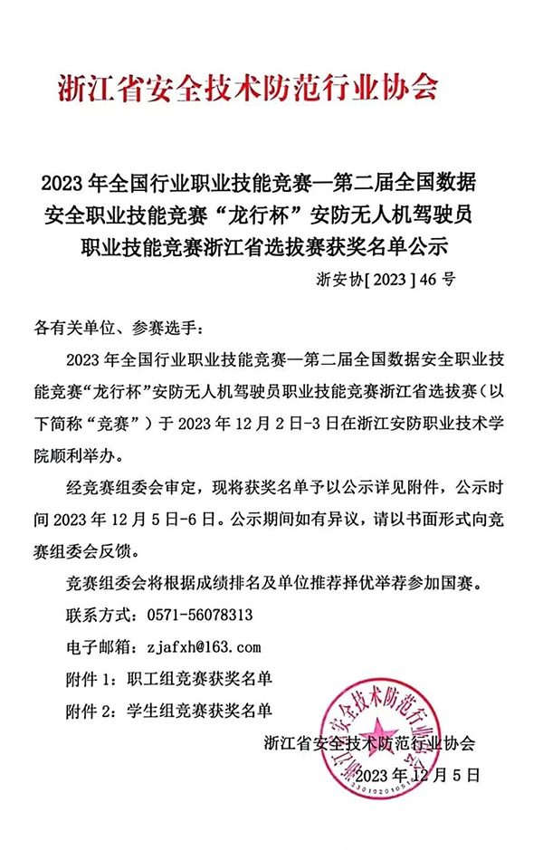 为大力弘扬劳模精神、劳动精神、工匠精神,激励更多劳动者,培养更多大国工匠、高技能人才,12月2日-3日,浙江省安防协会开展以“技能成才 技能报国”为主题的2023年全国行业职业技能竞赛—第二届全国数据安全职业技能竞赛 “龙行杯”安防无人机驾驶员职业技能竞赛。