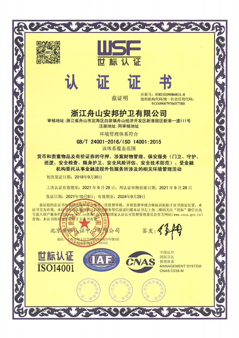 自2018年起,公司对货币和贵重物品及有价证券的守押、涉案财物管理、保安服务(门卫、守护、巡逻、安全检查、随身护卫、安全风险评估、安全技术防范)、受金融机构委托从事金融流程外包服务所涉及的相关环境管理活动进行了环境管理体系认证,并每年通过年审获得相关证书。